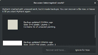 In the image above is what happens when I reload it after a crash. The window is a annoying pop-up ad - offering to restore crashed drawings, or ignore them until I restart MyPaint (to see it again)... You can also see it recorded 0 seconds of drawing time for any of them, so there is nothing to even restore.
